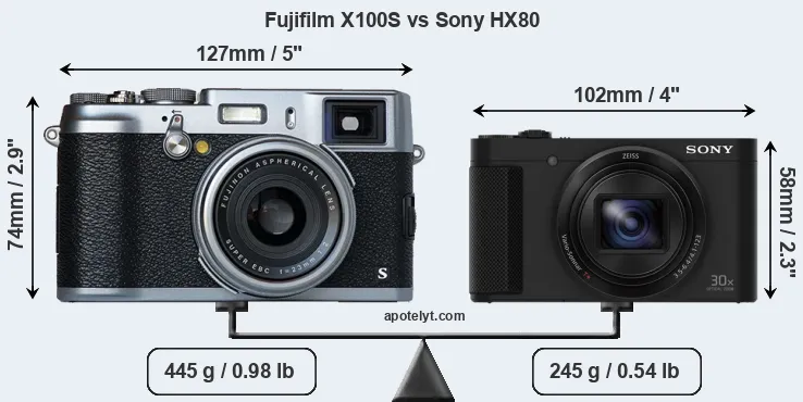 The physical size and weight of the Fujifilm X100S and the Sony HX80 are illustrated in the side-by-side display below. The two cameras are presented according to their relative size. Three consecutive perspectives from the front, the top, and the back are available. All size dimensions are rounded to the nearest millimeter.