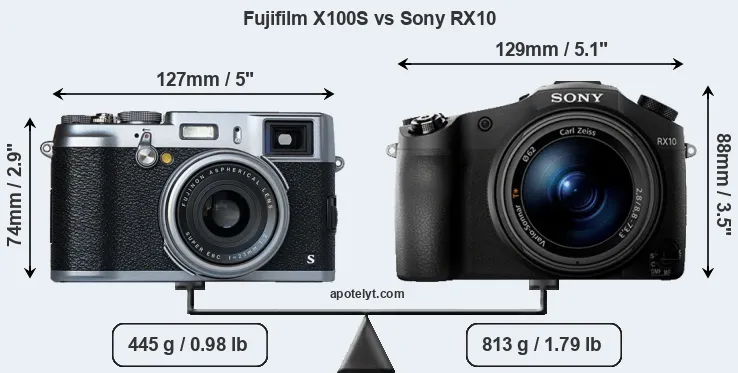 The physical size and weight of the Fujifilm X100S and the Sony RX10 are illustrated in the side-by-side display below. The two cameras are presented according to their relative size. Three successive views from the front, the top, and the rear are shown. All width, height and depth dimensions are rounded to the nearest millimeter.