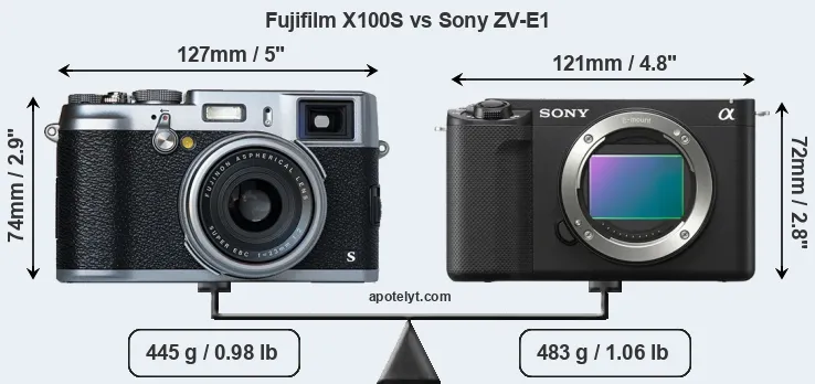The above size and weight comparisons are to some extent incomplete and possibly misleading, as the X100S has a lens built in, whereas the ZV-E1 is an interchangeable lens camera that requires a separate lens. Attaching the latter will add extra weight and bulk to the setup. You can compare the optics available for the ZV-E1 and their specifications in the Sony FE Lens Catalog.