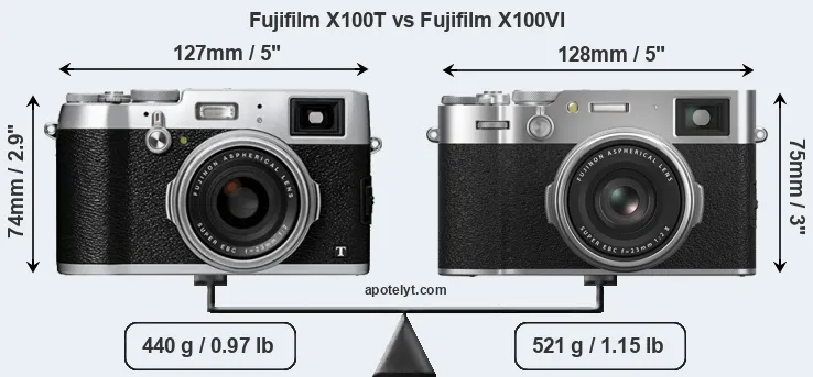 If the front view area (width x height) of the cameras is taken as an aggregate measure of their size, the Fujifilm X100VI is somewhat larger (2 percent) than the Fujifilm X100T. Moreover, the X100VI is markedly heavier (18 percent) than the X100T. It is noteworthy in this context that the X100VI is splash and dust-proof, while the X100T does not feature any corresponding weather-sealing.