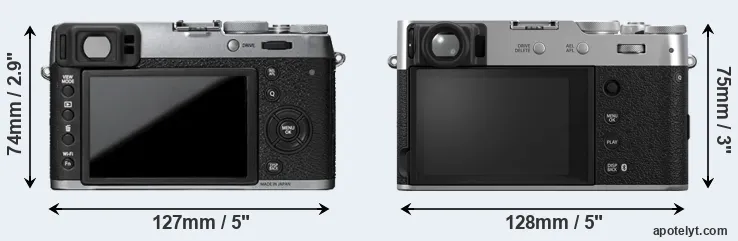The physical size and weight of the Fujifilm X100T and the Fujifilm X100VI are illustrated in the side-by-side display below. The two cameras are presented according to their relative size. Three consecutive views from the front, the top, and the rear side are shown. All width, height and depth dimensions are rounded to the nearest millimeter.