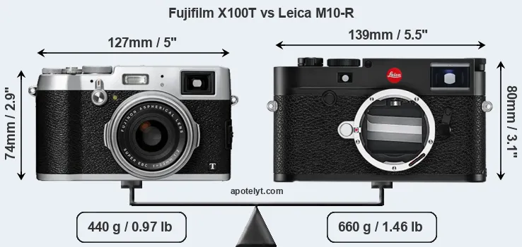 If the front view area (width x height) of the cameras is taken as an aggregate measure of their size, the Leica M10-R is notably larger (18 percent) than the Fujifilm X100T. It is noteworthy in this context that the M10-R is splash and dust-proof, while the X100T does not feature any corresponding weather-sealing.