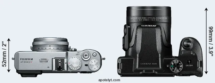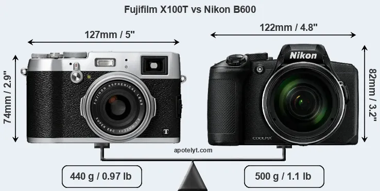 An illustration of the physical size and weight of the Fujifilm X100T and the Nikon B600 is provided in the side-by-side display below. The two cameras are presented according to their relative size. Three consecutive perspectives from the front, the top, and the back are available. All width, height and depth dimensions are rounded to the nearest millimeter.