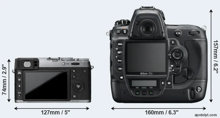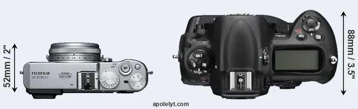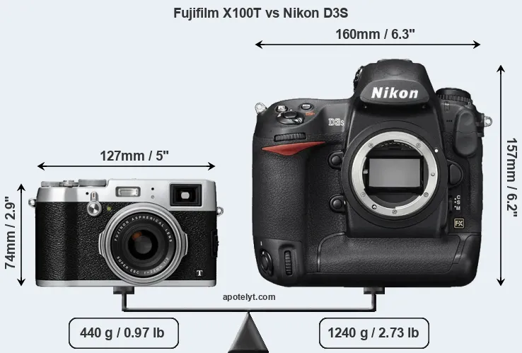 The physical size and weight of the Fujifilm X100T and the Nikon D3S are illustrated in the side-by-side display below. The two cameras are presented according to their relative size. Three consecutive perspectives from the front, the top, and the back are available. All width, height and depth dimensions are rounded to the nearest millimeter.