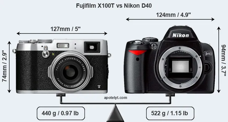 The physical size and weight of the Fujifilm X100T and the Nikon D40 are illustrated in the side-by-side display below. The two cameras are presented according to their relative size. Three consecutive perspectives from the front, the top, and the back are available. All width, height and depth dimensions are rounded to the nearest millimeter.