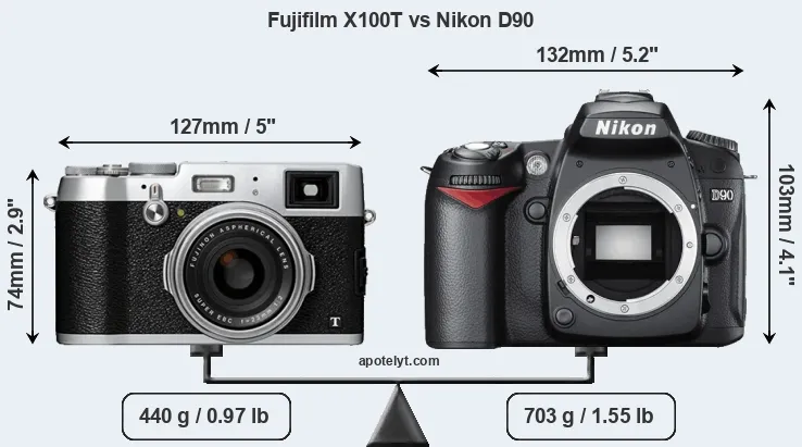 The above size and weight comparisons are to some extent incomplete and possibly misleading, as the X100T has a lens built in, whereas the D90 is an interchangeable lens camera that requires a separate lens. Attaching the latter will add extra weight and bulk to the setup. You can compare the optics available for the D90 and their specifications in the Nikon Lens Catalog.