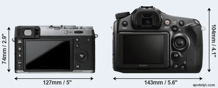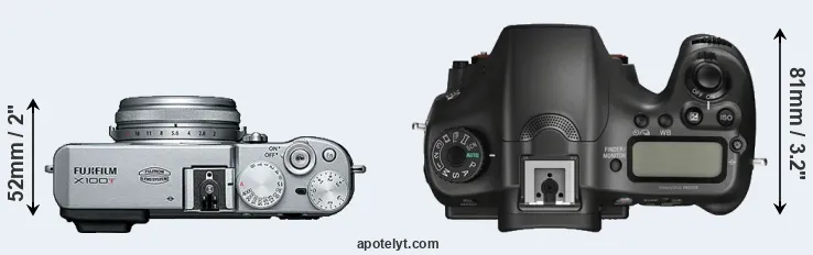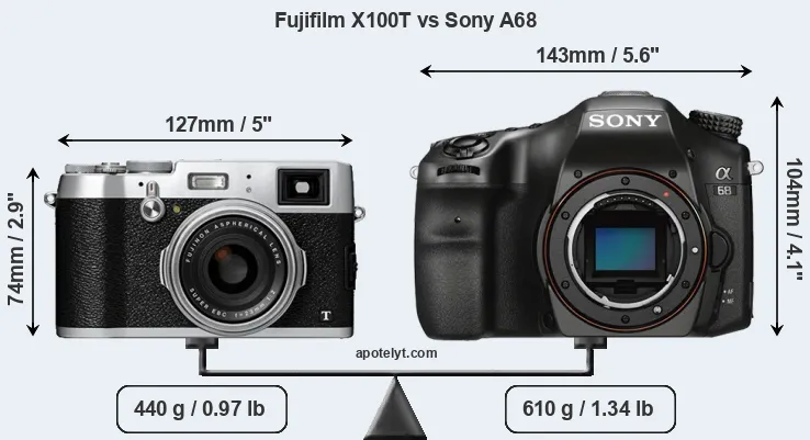 The side-by-side display below illustrates the physical size and weight of the Fujifilm X100T and the Sony A68. The two cameras are presented according to their relative size. Three successive views from the front, the top, and the rear are shown. All width, height and depth dimensions are rounded to the nearest millimeter.