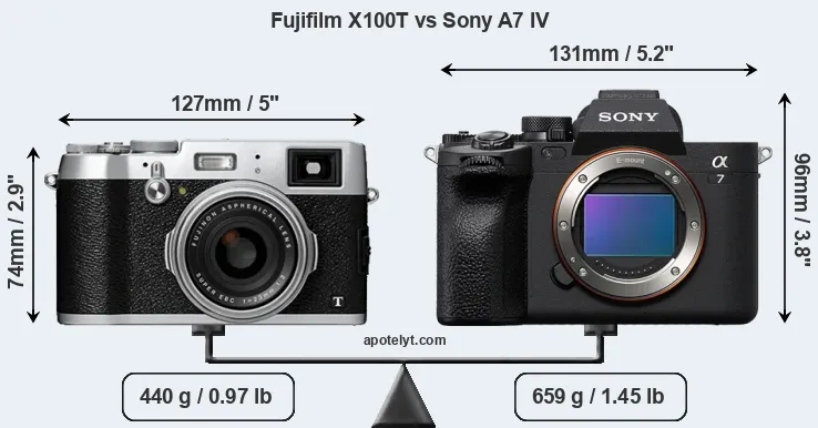 If the front view area (width x height) of the cameras is taken as an aggregate measure of their size, the Sony A7 IV is notably larger (34 percent) than the Fujifilm X100T. It is noteworthy in this context that the A7 IV is splash and dust-proof, while the X100T does not feature any corresponding weather-sealing.