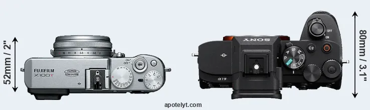 The physical size and weight of the Fujifilm X100T and the Sony A7 IV are illustrated in the side-by-side display below. The two cameras are presented according to their relative size. Three consecutive views from the front, the top, and the rear side are shown. All width, height and depth measures are rounded to the nearest millimeter.