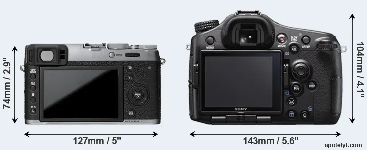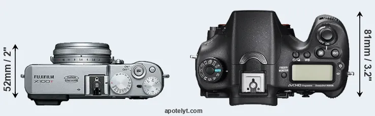 The side-by-side display below illustrates the physical size and weight of the Fujifilm X100T and the Sony A77 II. The two cameras are presented according to their relative size. Three successive views from the front, the top, and the rear are shown. All width, height and depth dimensions are rounded to the nearest millimeter.