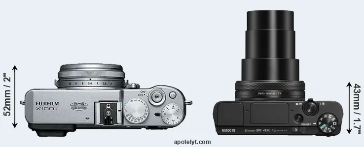 The physical size and weight of the Fujifilm X100T and the Sony RX100 VII are illustrated in the side-by-side display below. The two cameras are presented according to their relative size. Three successive views from the front, the top, and the rear are shown. All size dimensions are rounded to the nearest millimeter.