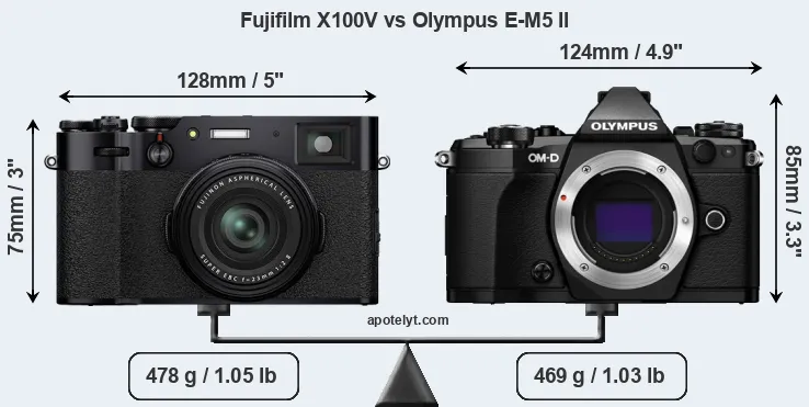 An illustration of the physical size and weight of the Fujifilm X100V and the Olympus E-M5 II is provided in the side-by-side display below. The two cameras are presented according to their relative size. Three consecutive perspectives from the front, the top, and the back are available. All width, height and depth dimensions are rounded to the nearest millimeter.