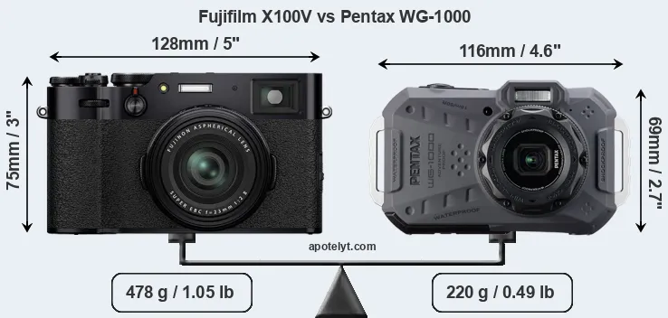 The physical size and weight of the Fujifilm X100V and the Pentax WG-1000 are illustrated in the side-by-side display below. The two cameras are presented according to their relative size. Three successive views from the front, the top, and the rear are shown. All width, height and depth measures are rounded to the nearest millimeter.