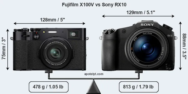The side-by-side display below illustrates the physical size and weight of the Fujifilm X100V and the Sony RX10. The two cameras are presented according to their relative size. Three consecutive views from the front, the top, and the rear side are shown. All width, height and depth dimensions are rounded to the nearest millimeter.
