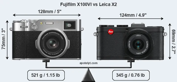 An illustration of the physical size and weight of the Fujifilm X100VI and the Leica X2 is provided in the side-by-side display below. The two cameras are presented according to their relative size. Three successive views from the front, the top, and the rear are shown. All width, height and depth measures are rounded to the nearest millimeter.