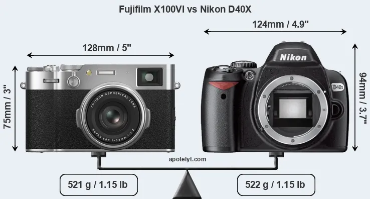 The above size and weight comparisons are to some extent incomplete and possibly misleading, as the X100VI has a lens built in, whereas the D40X is an interchangeable lens camera that requires a separate lens. Attaching the latter will add extra weight and bulk to the setup. You can compare the optics available for the D40X and their specifications in the Nikon Lens Catalog.