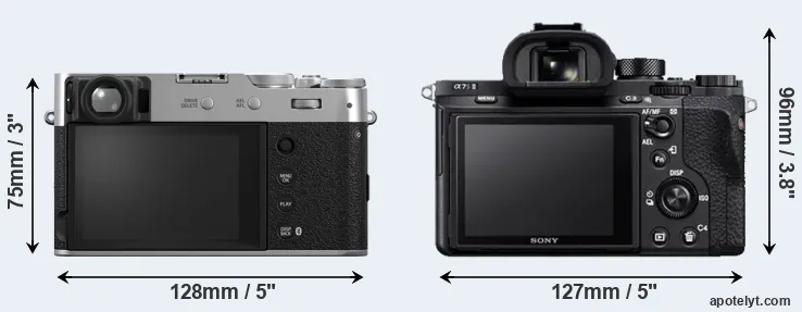 If the front view area (width x height) of the cameras is taken as an aggregate measure of their size, the Sony A7S II is notably larger (27 percent) than the Fujifilm X100VI. In this context, it is worth noting that both cameras are splash and dust-proof and can, hence, be used in inclement weather conditions or harsh environments.