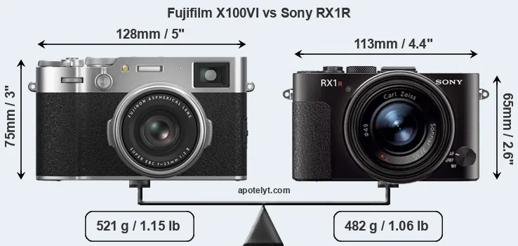 The side-by-side display below illustrates the physical size and weight of the Fujifilm X100VI and the Sony RX1R. The two cameras are presented according to their relative size. Three consecutive perspectives from the front, the top, and the back are available. All width, height and depth dimensions are rounded to the nearest millimeter.