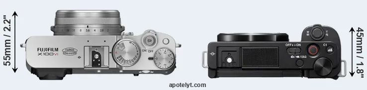 The side-by-side display below illustrates the physical size and weight of the Fujifilm X100VI and the Sony ZV-E10. The two cameras are presented according to their relative size. Three consecutive views from the front, the top, and the rear side are shown. All width, height and depth dimensions are rounded to the nearest millimeter.
