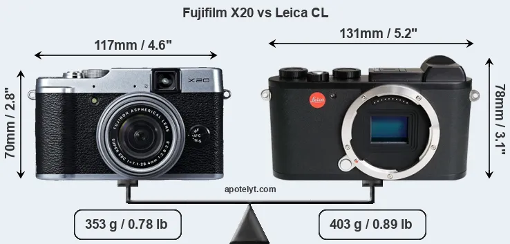 The physical size and weight of the Fujifilm X20 and the Leica CL are illustrated in the side-by-side display below. The two cameras are presented according to their relative size. Three successive views from the front, the top, and the rear are shown. All width, height and depth measures are rounded to the nearest millimeter.