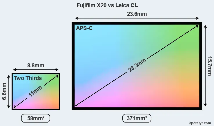 Of the two cameras under consideration, the Fujifilm X20 features a 2/3 sensor and the Leica CL an APS-C sensor. The sensor area in the CL is 540 percent bigger. As a result of these sensor size differences, the cameras have a format factor of, respectively, 3.9 and 1.5. The sensor in the X20 has a native 4:3 aspect ratio, while the one in the CL offers a 3:2 aspect.