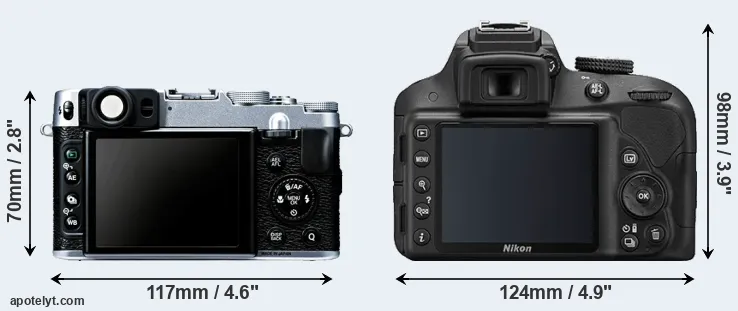 The side-by-side display below illustrates the physical size and weight of the Fujifilm X20 and the Nikon D3300. The two cameras are presented according to their relative size. Three consecutive views from the front, the top, and the rear side are shown. All size dimensions are rounded to the nearest millimeter.