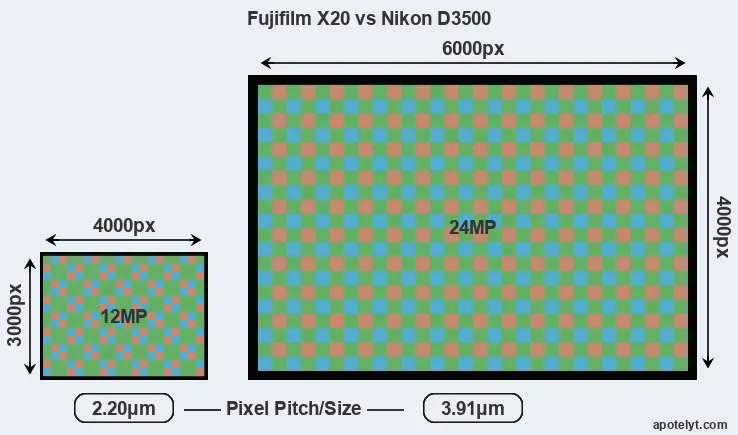 | Sensor Specs | Fujifilm X20 | Nikon D3500 |