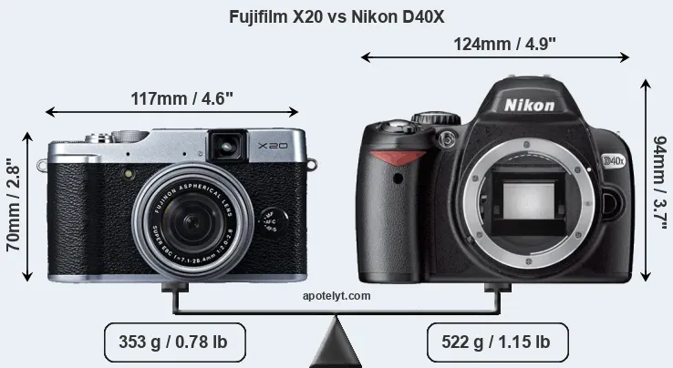 An illustration of the physical size and weight of the Fujifilm X20 and the Nikon D40X is provided in the side-by-side display below. The two cameras are presented according to their relative size. Three consecutive views from the front, the top, and the rear side are shown. All size dimensions are rounded to the nearest millimeter.