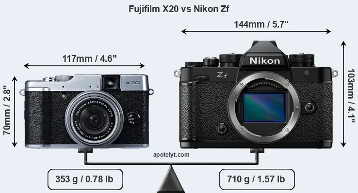 If the front view area (width x height) of the cameras is taken as an aggregate measure of their size, the Nikon Zf is considerably larger (81 percent) than the Fujifilm X20. It is noteworthy in this context that the Zf is splash and dust-proof, while the X20 does not feature any corresponding weather-sealing.