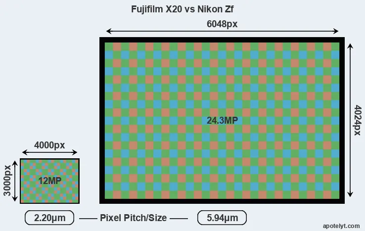 With 24.3MP, the Zf offers a higher resolution than the X20 (12MP), but the Zf nevertheless has larger individual pixels (pixel pitch of 5.94μm versus 2.20μm for the X20) due to its larger sensor. Moreover, the Zf is a much more recent model (by 10 years and 8 months) than the X20, and its sensor will have benefitted from technological advances during this time that further enhance the light gathering capacity of its pixel-units. Coming back to sensor resolution, it should be mentioned that the X20 has no anti-alias filter installed, so that it can capture all the detail its sensor resolves.