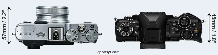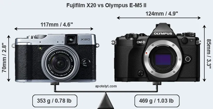 If the front view area (width x height) of the cameras is taken as an aggregate measure of their size, the Olympus E-M5 II is notably larger (29 percent) than the Fujifilm X20. It is noteworthy in this context that the E-M5 II is splash and dust-proof, while the X20 does not feature any corresponding weather-sealing.