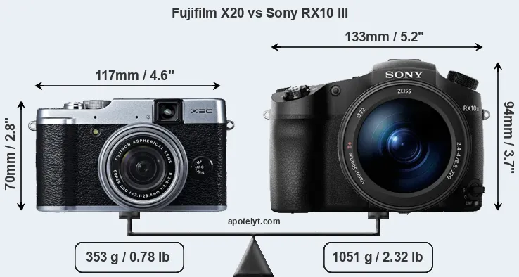 If the front view area (width x height) of the cameras is taken as an aggregate measure of their size, the Sony RX10 III is considerably larger (53 percent) than the Fujifilm X20. Moreover, the RX10 III is substantially heavier (198 percent) than the X20. It is noteworthy in this context that the RX10 III is splash and dust-proof, while the X20 does not feature any corresponding weather-sealing.