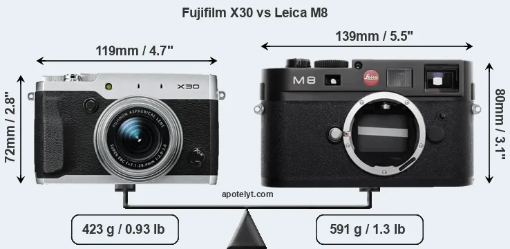 An illustration of the physical size and weight of the Fujifilm X30 and the Leica M8 is provided in the side-by-side display below. The two cameras are presented according to their relative size. Three consecutive perspectives from the front, the top, and the back are available. All width, height and depth dimensions are rounded to the nearest millimeter.