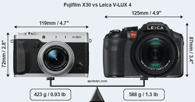 The physical size and weight of the Fujifilm X30 and the Leica V-LUX 4 are illustrated in the side-by-side display below. The two cameras are presented according to their relative size. Three consecutive perspectives from the front, the top, and the back are available. All width, height and depth measures are rounded to the nearest millimeter.