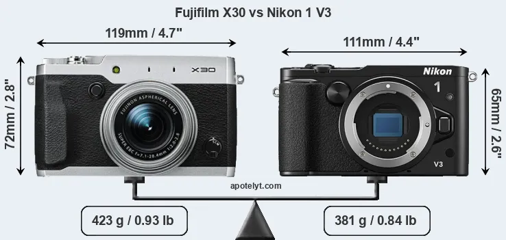 The side-by-side display below illustrates the physical size and weight of the Fujifilm X30 and the Nikon 1 V3. The two cameras are presented according to their relative size. Three consecutive views from the front, the top, and the rear side are shown. All width, height and depth measures are rounded to the nearest millimeter.