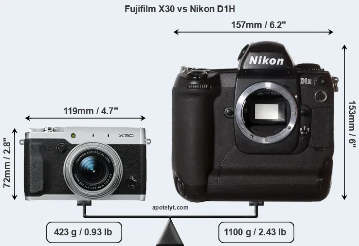 If the front view area (width x height) of the cameras is taken as an aggregate measure of their size, the Nikon D1H is considerably larger (180 percent) than the Fujifilm X30. It is noteworthy in this context that the D1H is splash and dust-proof, while the X30 does not feature any corresponding weather-sealing.