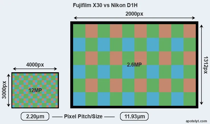 Despite having a smaller sensor, the Fujifilm X30 offers a higher resolution of 12 megapixels, compared with 2.6 MP of the Nikon D1H. This megapixels advantage comes at the cost of a higher pixel density and a smaller size of the individual pixel (with a pixel pitch of 2.20μm versus 11.93μm for the D1H). However, it should be noted that the X30 is much more recent (by 13 years and 6 months) than the D1H, and its sensor will have benefitted from technological advances during this time that make it possible to gather light more efficiently. Coming back to sensor resolution, it should be mentioned that the X30 has no anti-alias filter installed, so that it can capture all the detail its sensor resolves.