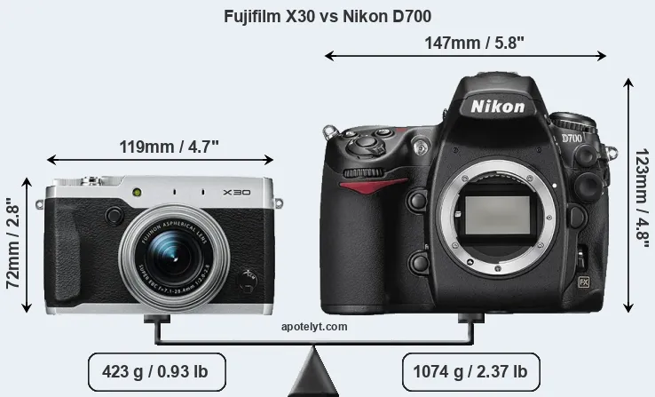 If the front view area (width x height) of the cameras is taken as an aggregate measure of their size, the Nikon D700 is considerably larger (111 percent) than the Fujifilm X30. It is noteworthy in this context that the D700 is splash and dust-proof, while the X30 does not feature any corresponding weather-sealing.