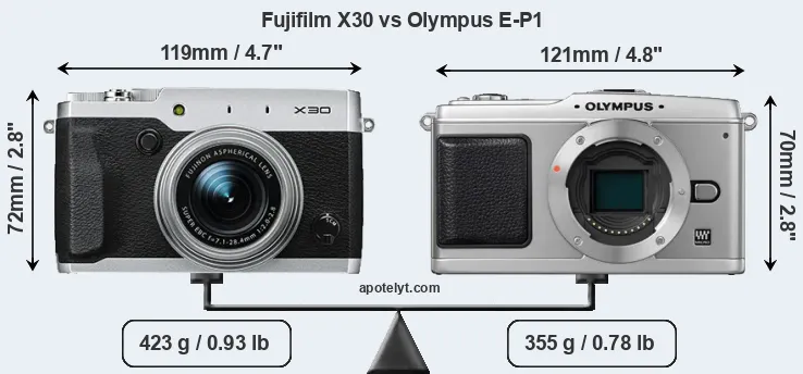 The physical size and weight of the Fujifilm X30 and the Olympus E-P1 are illustrated in the side-by-side display below. The two cameras are presented according to their relative size. Three consecutive views from the front, the top, and the rear side are shown. All width, height and depth measures are rounded to the nearest millimeter.