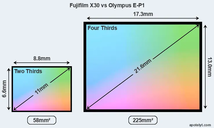 Of the two cameras under consideration, the Fujifilm X30 features a 2/3 sensor and the Olympus E-P1 a Four Thirds sensor. The sensor area in the E-P1 is 288 percent bigger. As a result of these sensor size differences, the cameras have a format factor of, respectively, 3.9 and 2.0. Both cameras feature a native aspect ratio (sensor width to sensor height) of 4:3.