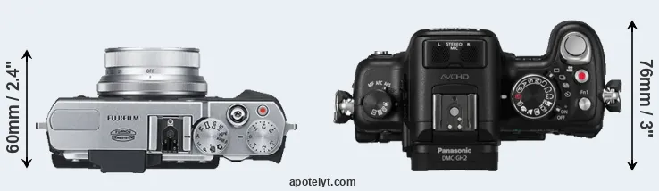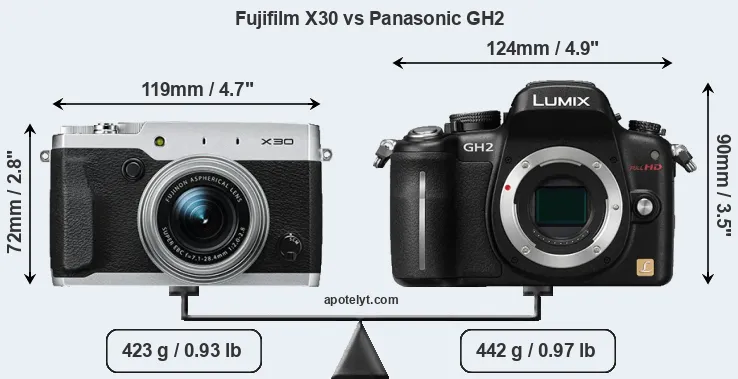 The side-by-side display below illustrates the physical size and weight of the Fujifilm X30 and the Panasonic GH2. The two cameras are presented according to their relative size. Three consecutive perspectives from the front, the top, and the back are available. All size dimensions are rounded to the nearest millimeter.