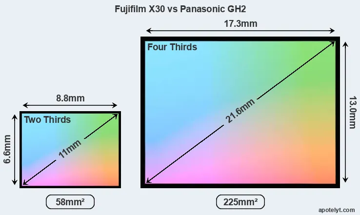 Of the two cameras under consideration, the Fujifilm X30 features a 2/3 sensor and the Panasonic GH2 a Four Thirds sensor. The sensor area in the GH2 is 288 percent bigger. As a result of these sensor size differences, the cameras have a format factor of, respectively, 3.9 and 2.0. Both cameras feature a native aspect ratio (sensor width to sensor height) of 4:3.