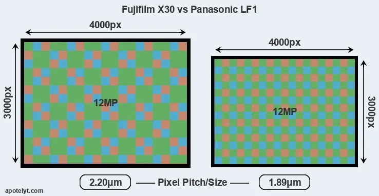 Even though the X30 has a larger sensor, both cameras offer the same resolution of 12 megapixels. This implies that the X30 has a lower pixel density and larger individual pixels (with a pixel pitch of 2.20μm versus 1.89μm for the LF1), which gives it a potential advantage in terms of light gathering capacity. In addition, the X30 is a somewhat more recent model (by 1 year and 4 months) than the LF1, and its sensor might have benefitted from technological advances during this time. Coming back to sensor resolution, it should be mentioned that the X30 has no anti-alias filter installed, so that it can capture all the detail its sensor resolves.