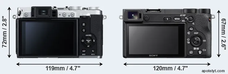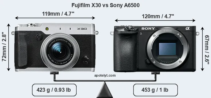 The physical size and weight of the Fujifilm X30 and the Sony A6500 are illustrated in the side-by-side display below. The two cameras are presented according to their relative size. Three consecutive perspectives from the front, the top, and the back are available. All width, height and depth measures are rounded to the nearest millimeter.