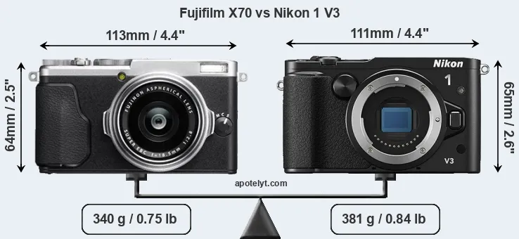 If the front view area (width x height) of the cameras is taken as an aggregate measure of their size, the Fujifilm X70 and the Nikon 1 V3 are of equal size. In this context, it is worth noting that neither the X70 nor the V3 are weather-sealed.