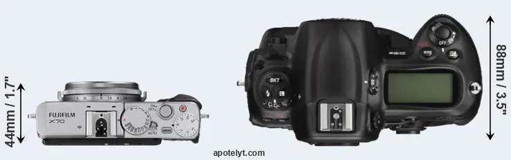 The physical size and weight of the Fujifilm X70 and the Nikon D3X are illustrated in the side-by-side display below. The two cameras are presented according to their relative size. Three consecutive perspectives from the front, the top, and the back are available. All width, height and depth dimensions are rounded to the nearest millimeter.