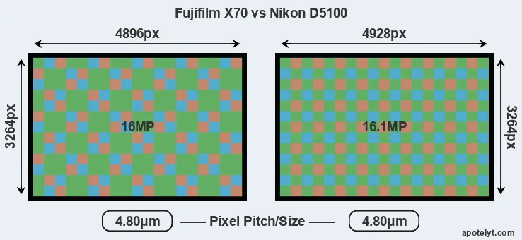 | Sensor Specs | Fujifilm X70 | Nikon D5100 |
