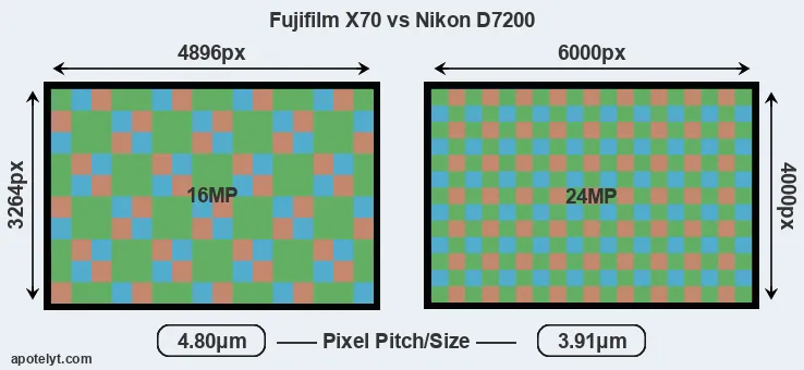 | Sensor Specs | Fujifilm X70 | Nikon D7200 |