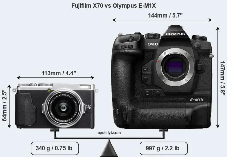 If the front view area (width x height) of the cameras is taken as an aggregate measure of their size, the Olympus E-M1X is considerably larger (193 percent) than the Fujifilm X70. It is noteworthy in this context that the E-M1X is splash and dust-proof, while the X70 does not feature any corresponding weather-sealing.