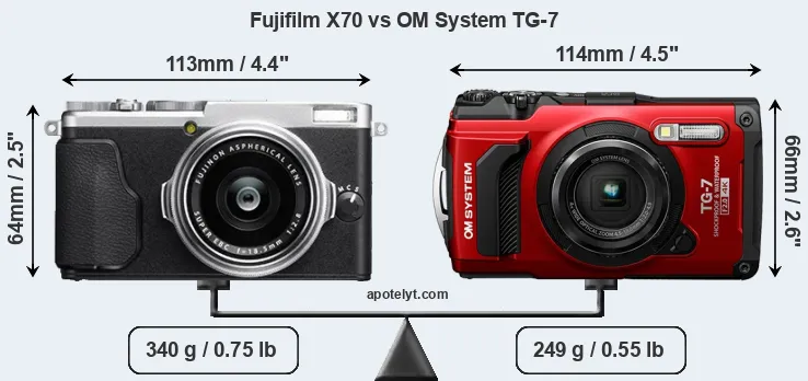 If the front view area (width x height) of the cameras is taken as an aggregate measure of their size, the OM System TG-7 is somewhat larger (4 percent) than the Fujifilm X70. However, the TG-7 is markedly lighter (27 percent) than the X70. It is noteworthy in this context that the TG-7 is splash and dust-proof, while the X70 does not feature any corresponding weather-sealing. More than that, the TG-7 is water-proof up to 15m and can, thus, be used for underwater photography.